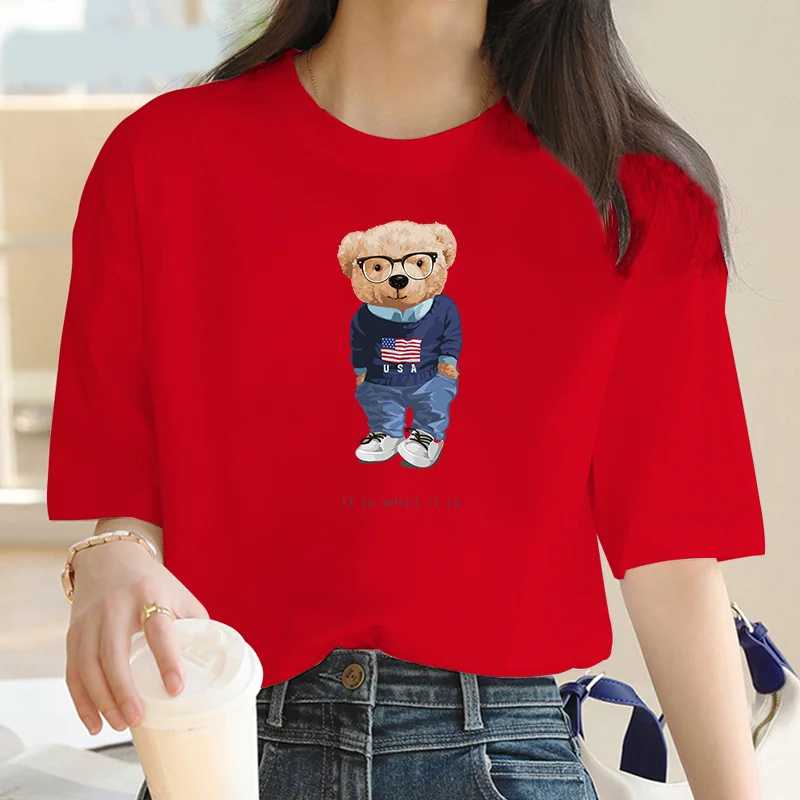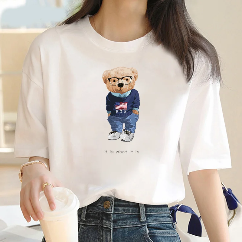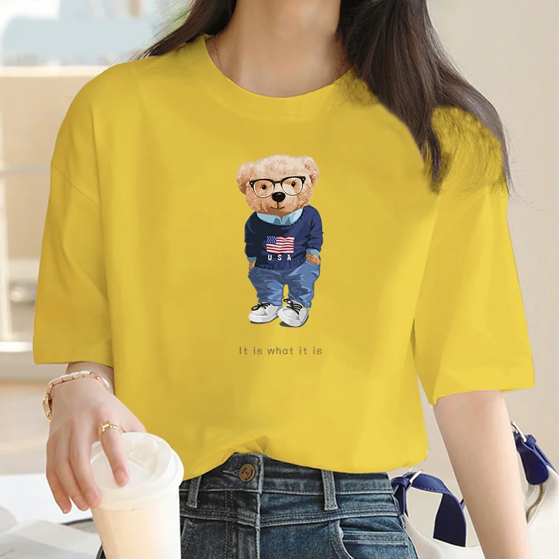 2024 Summer casual cartoon Bear print crew neck Short sleeve T-shirt Women's fashion oversized Y2K splicing loose T-shirt top