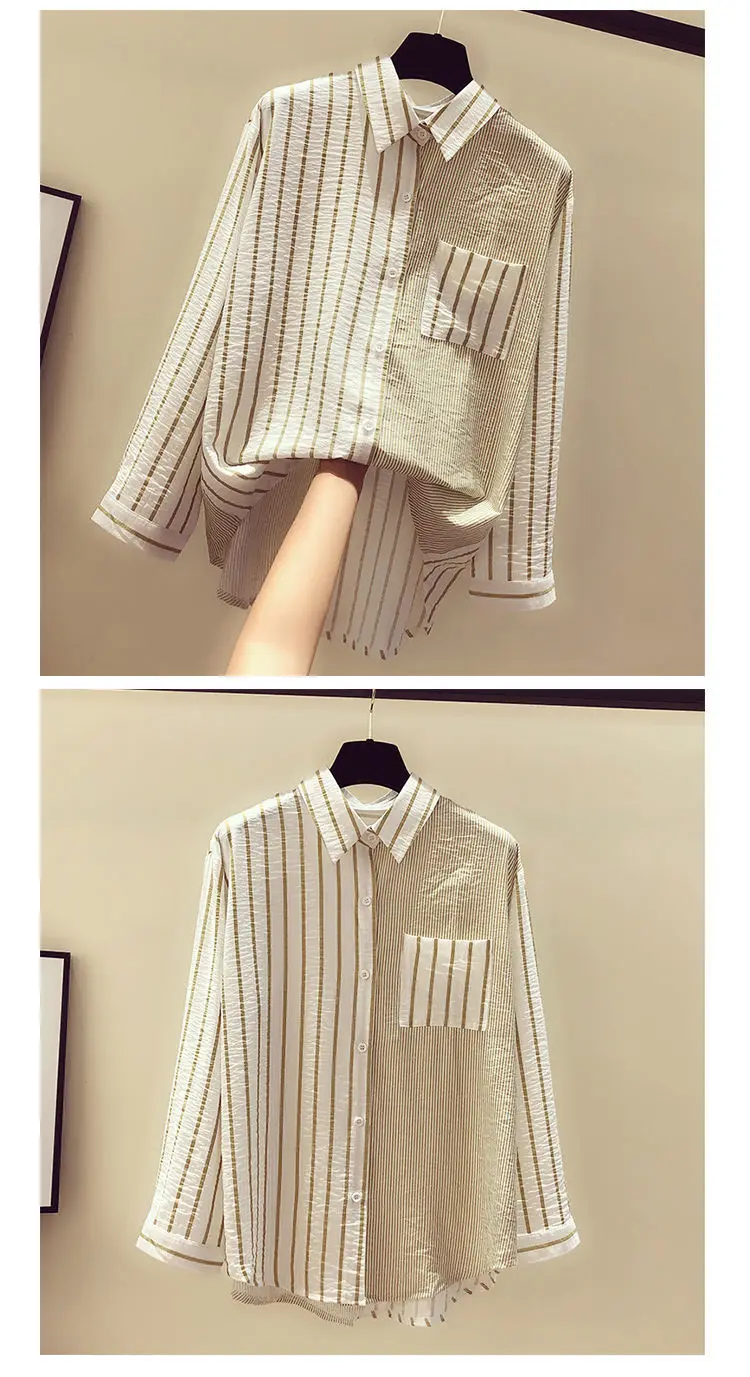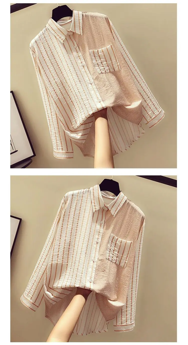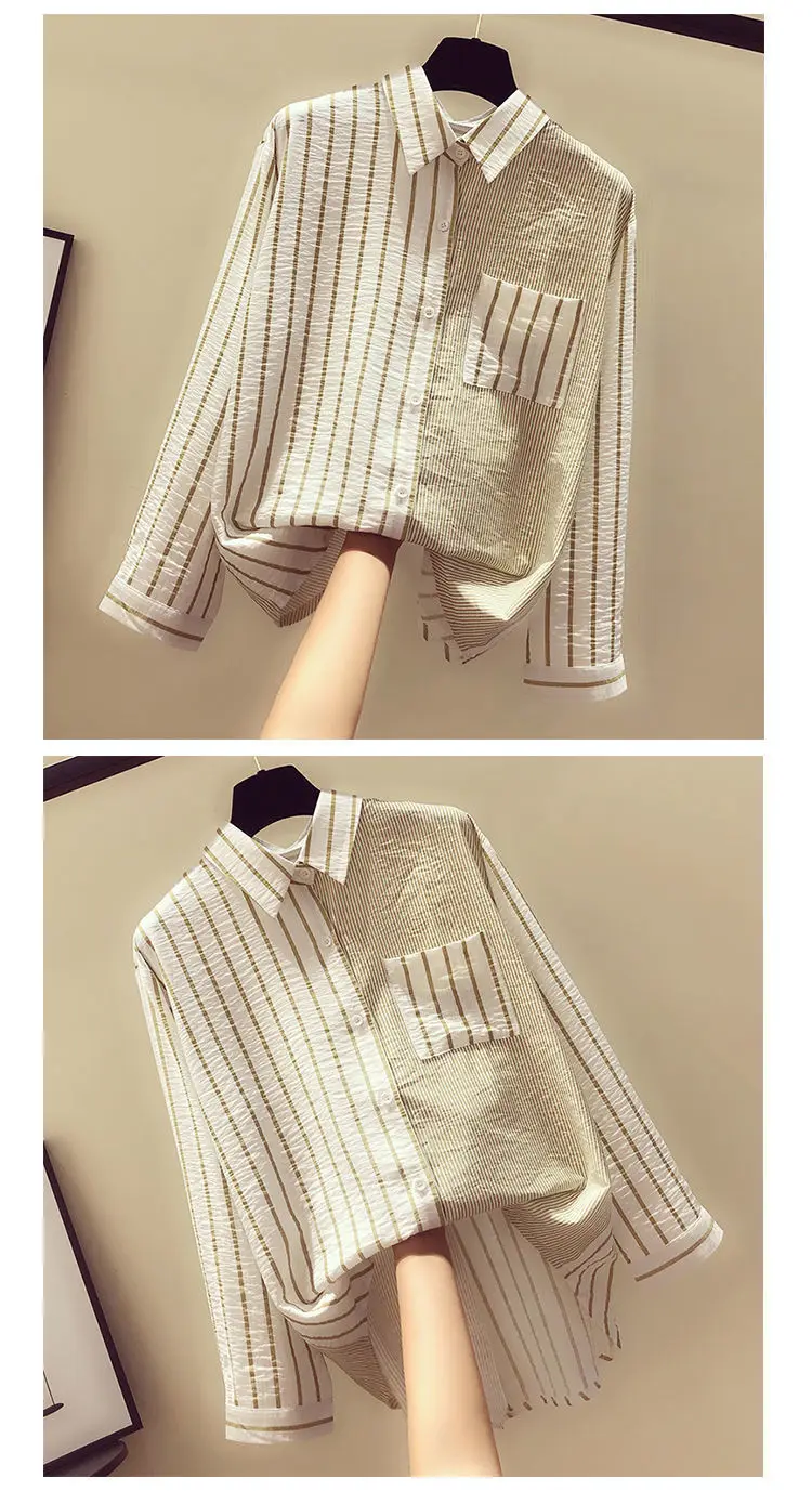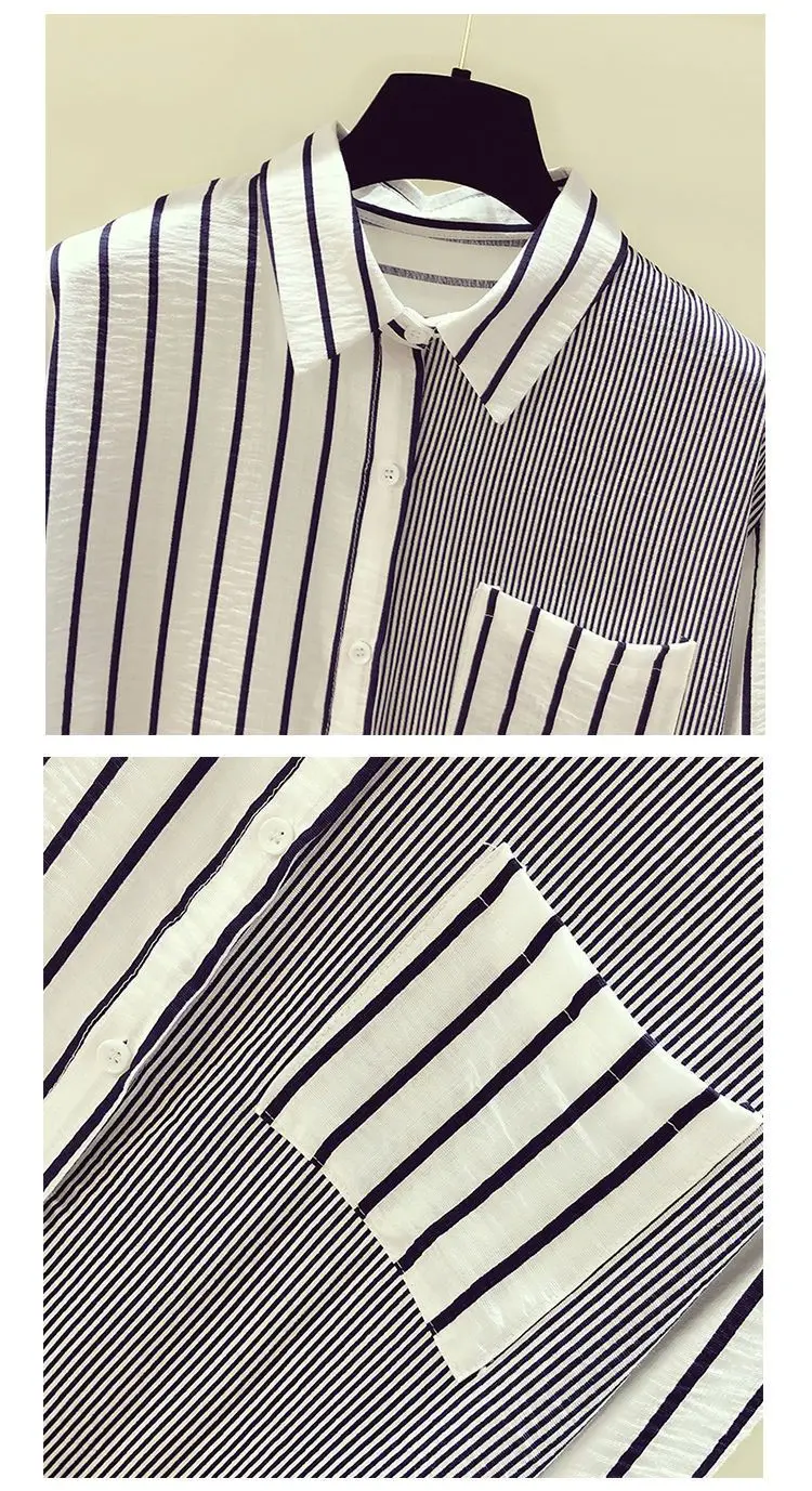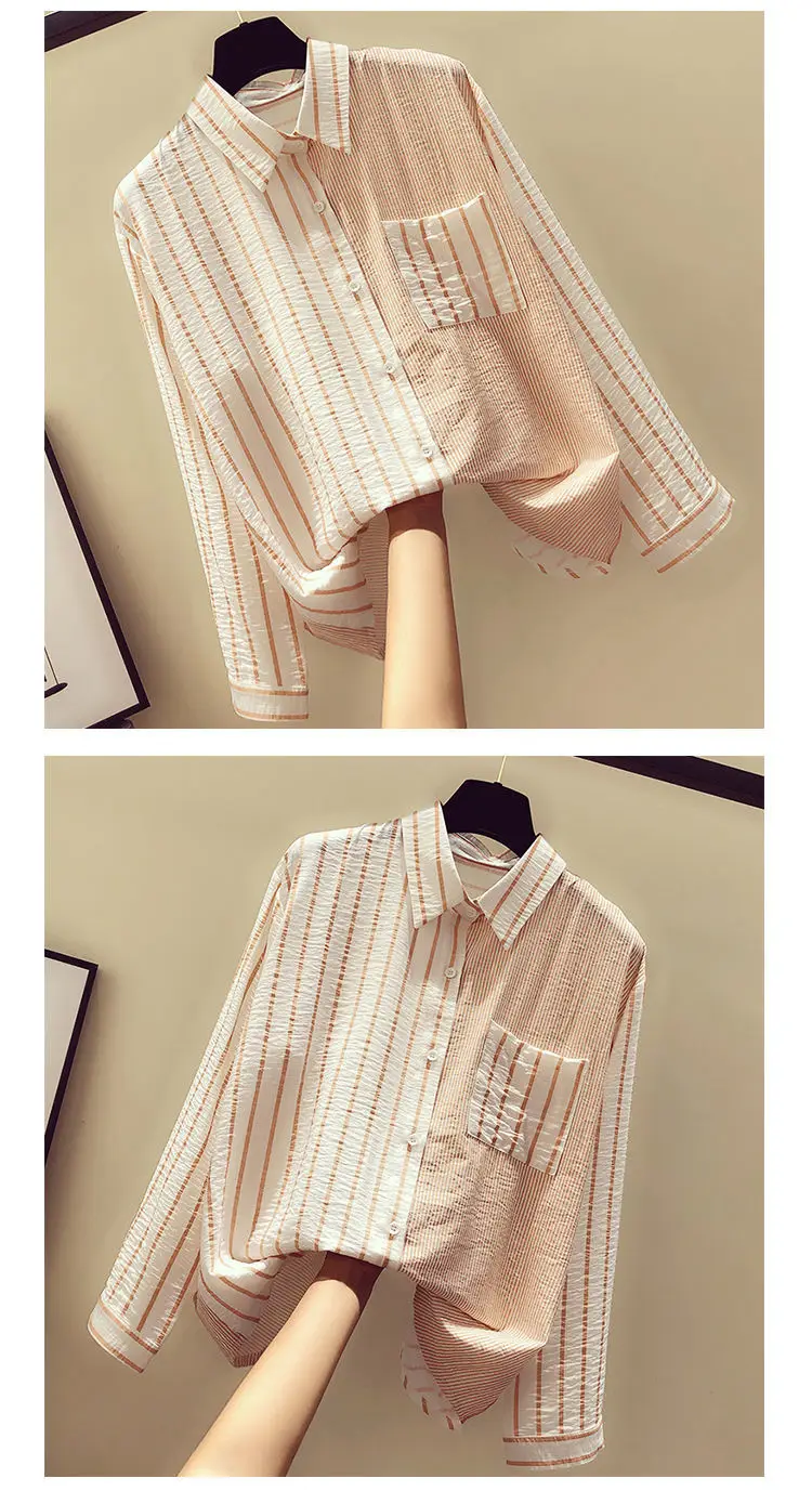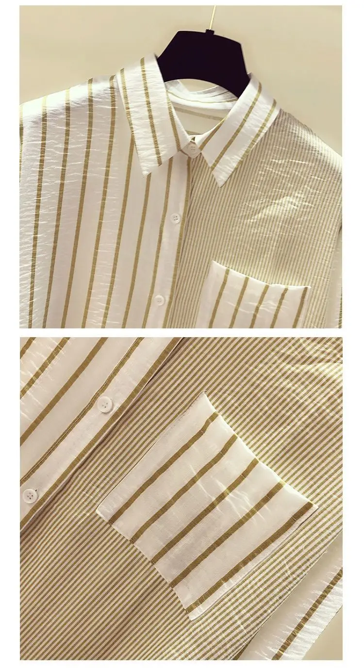 2025 Korean Summer Thin Trendy Striped Women's Shirt & Blouses Patchwork Pocket Loose Casual Office Lady Shirt Sweet Women's Top