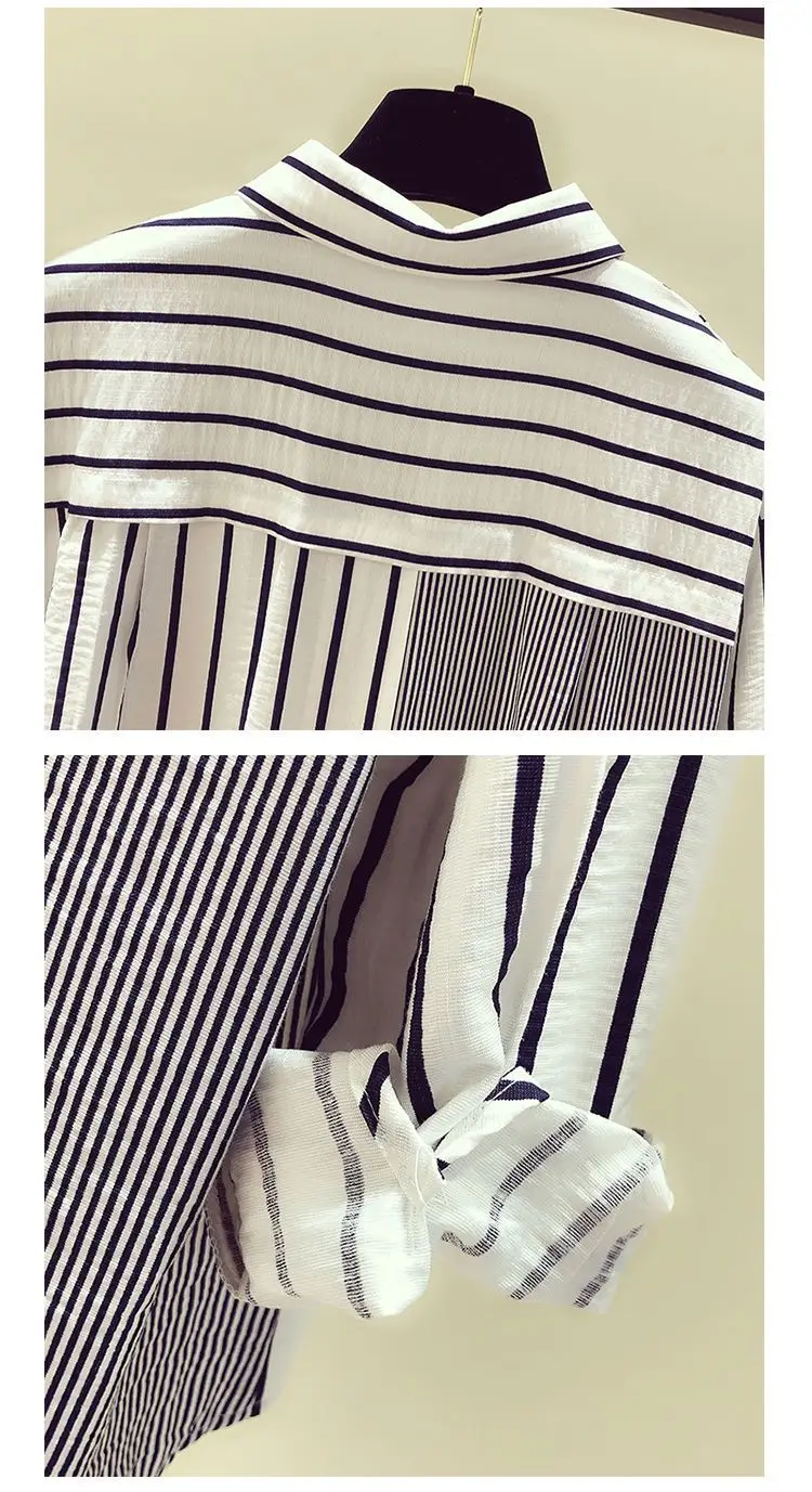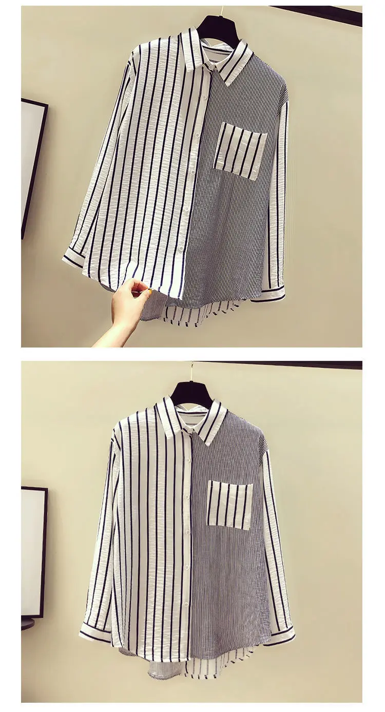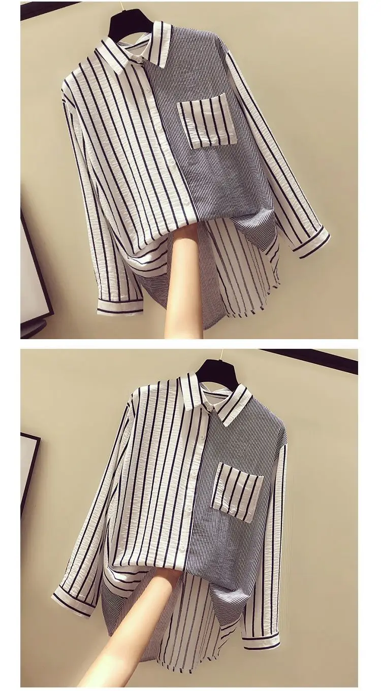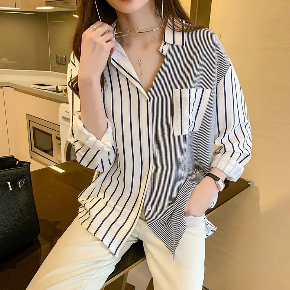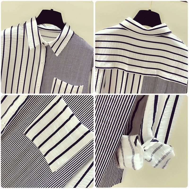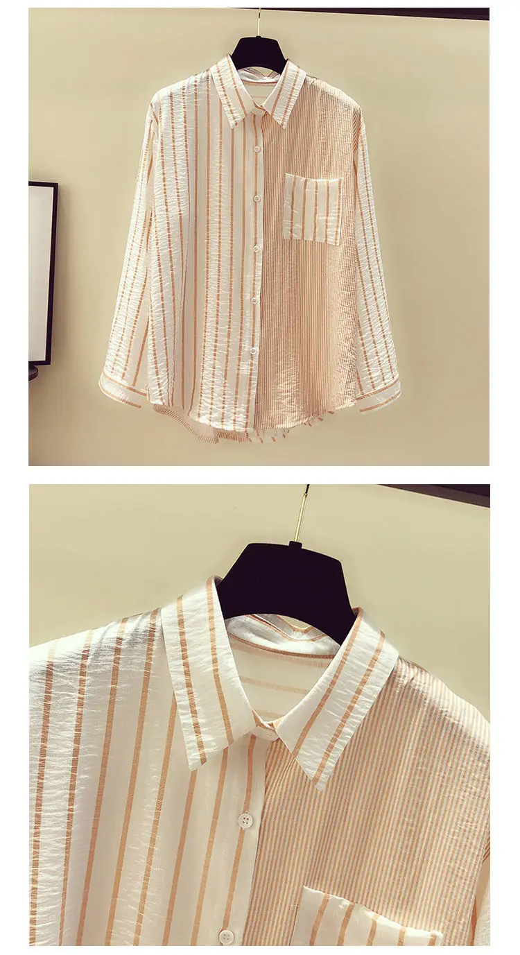 2025 Korean Summer Thin Trendy Striped Women's Shirt & Blouses Patchwork Pocket Loose Casual Office Lady Shirt Sweet Women's Top