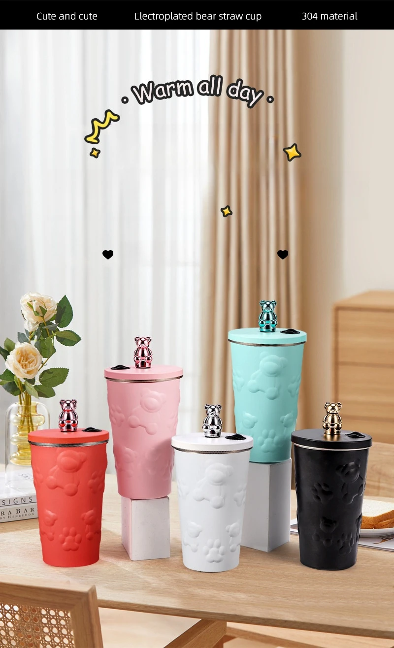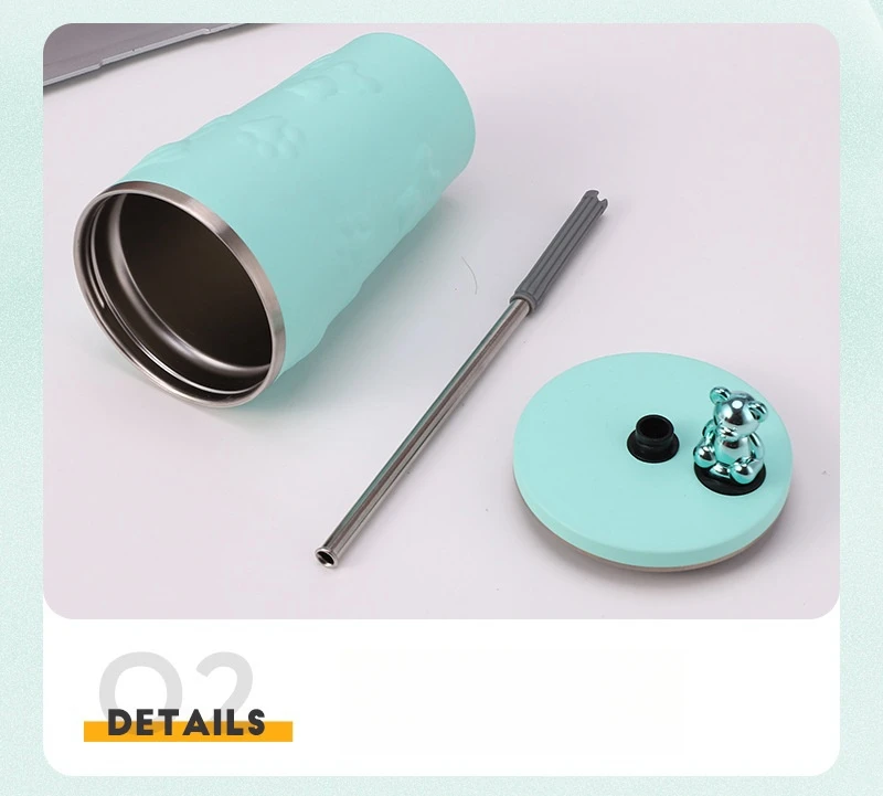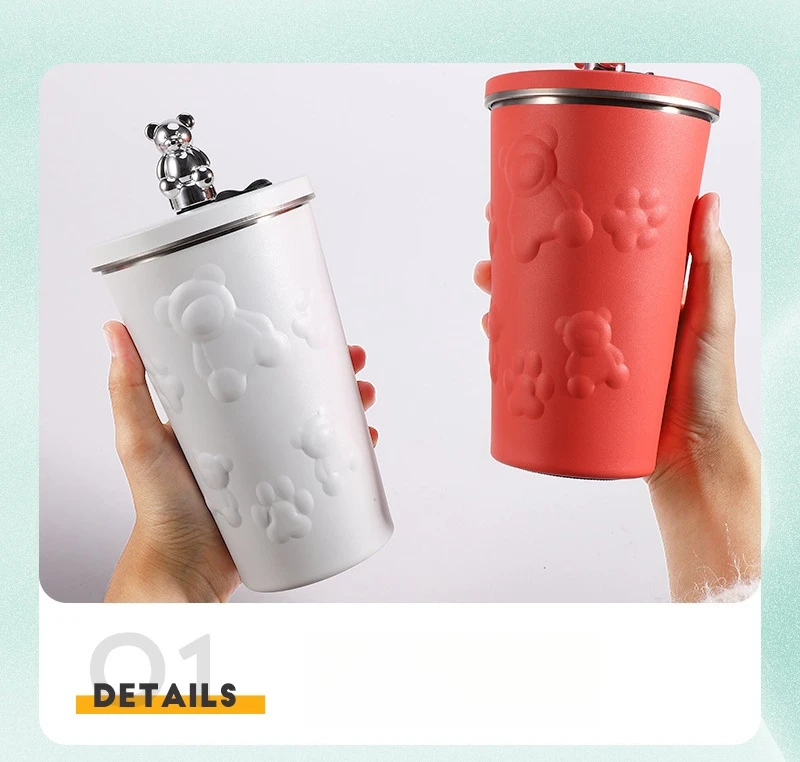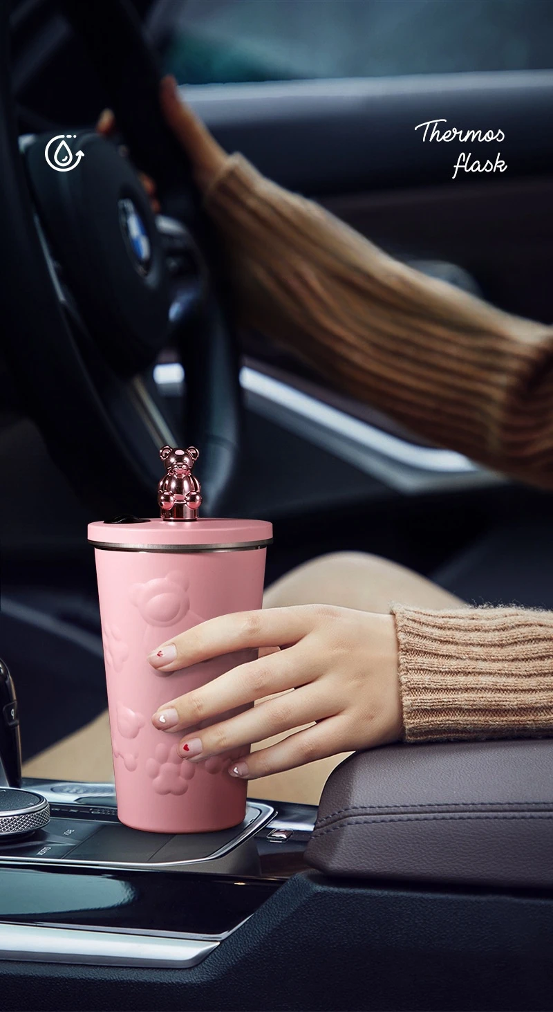 600ml Cute Bear 304 Stainless Steel Coffee Thermos Double Wall Vacuum Insulation with Straw Outdoor Water Bottle Car Cup