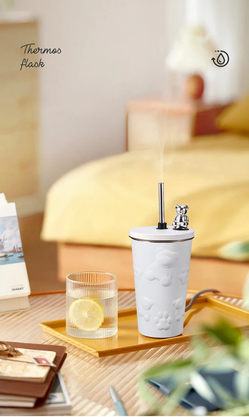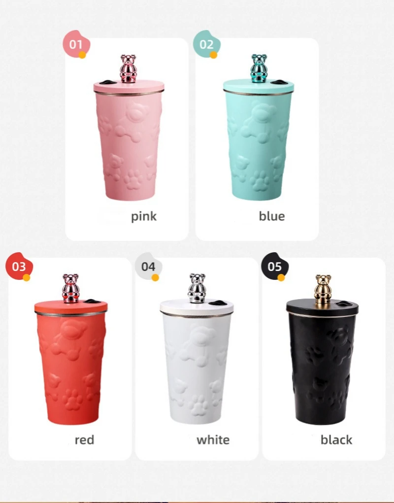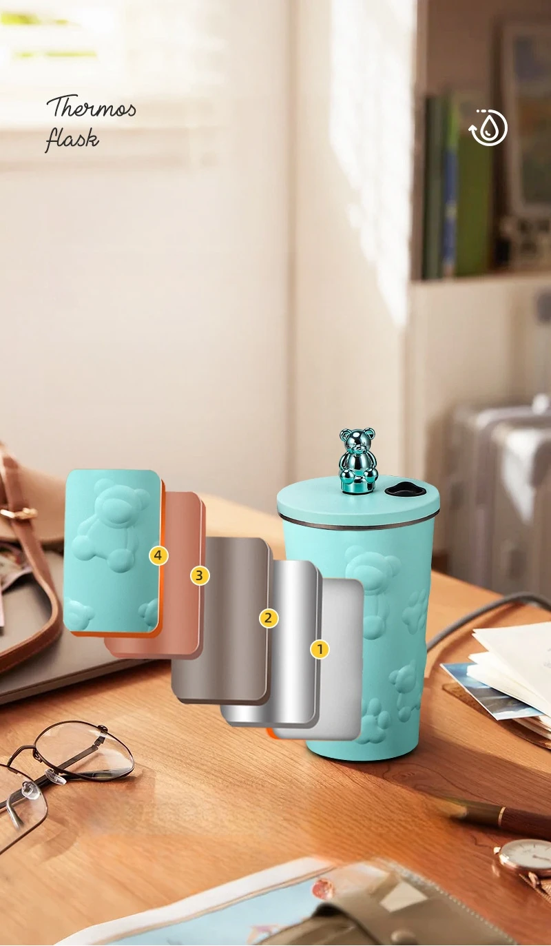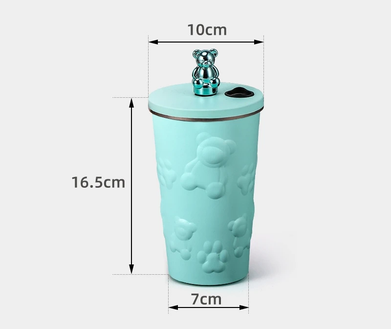 600ml Cute Bear 304 Stainless Steel Coffee Thermos Double Wall Vacuum Insulation with Straw Outdoor Water Bottle Car Cup