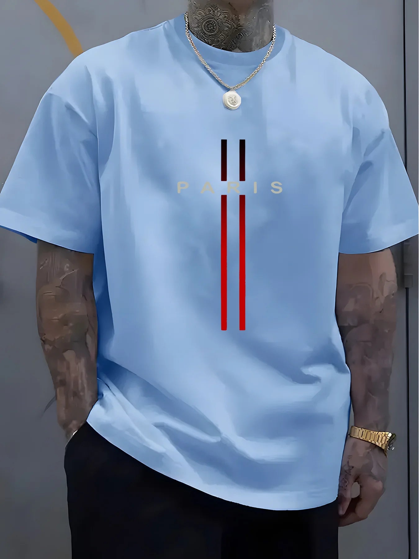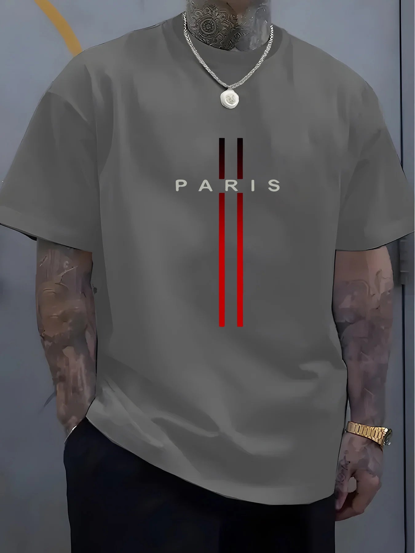 Summer men's 100% pure cotton casual loose fit plus size PARIS letter pattern printed round neck short sleeved T-shirt top