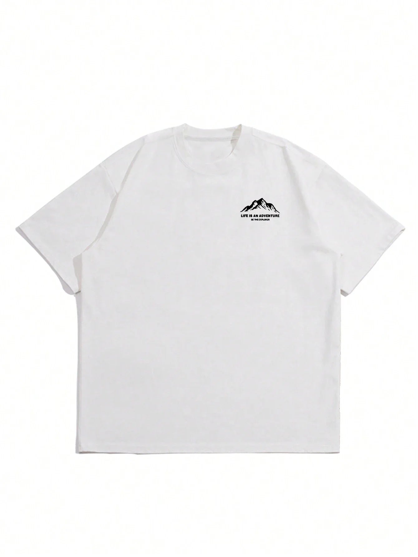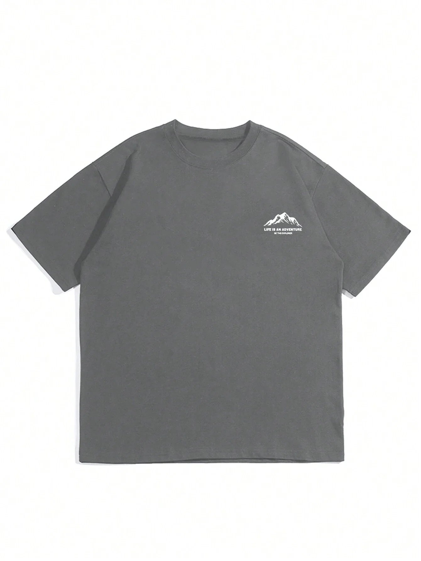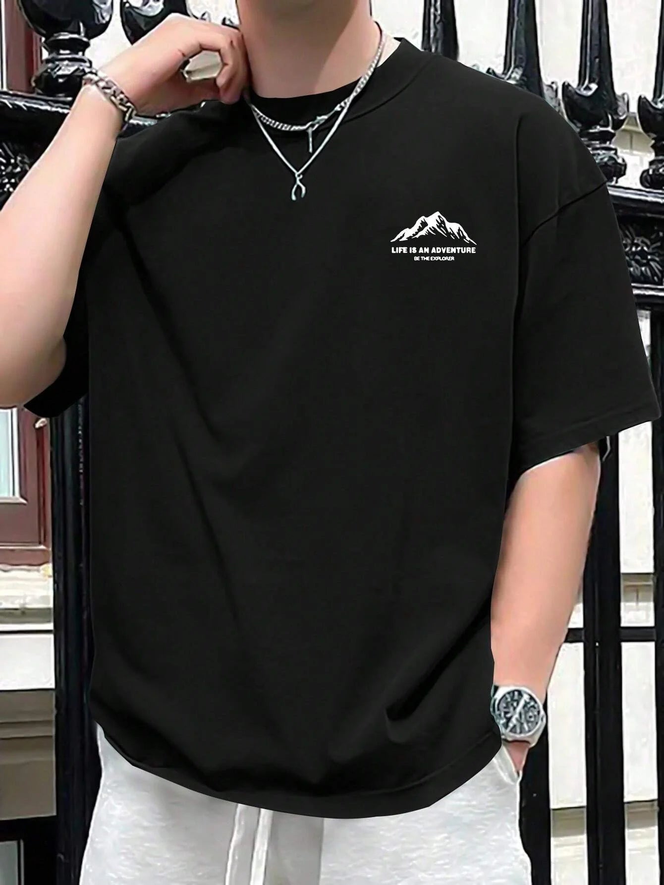 Summer men's 100% pure cotton casual loose plus size Letter And Mountain pattern printed round neck short sleeved T-shirt top