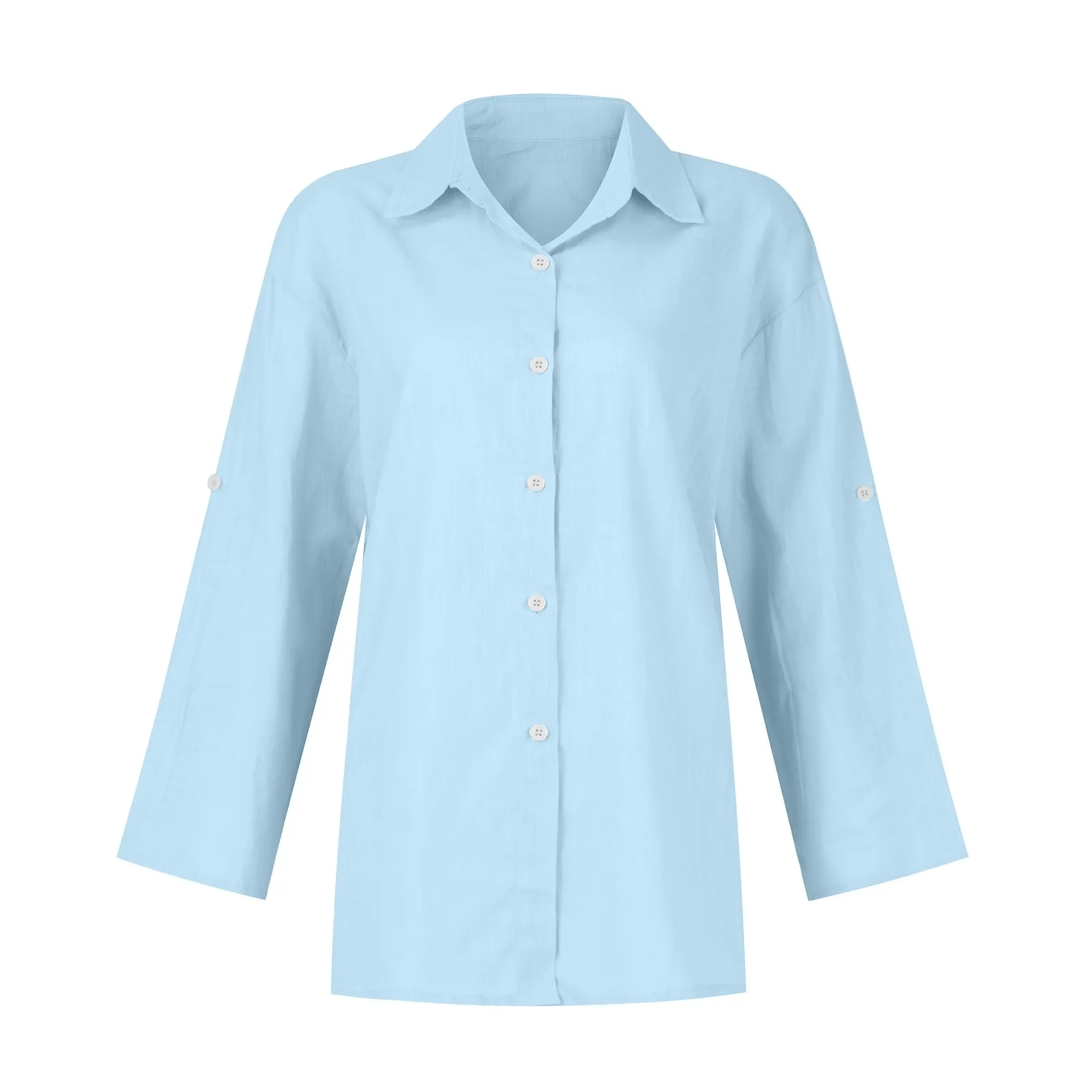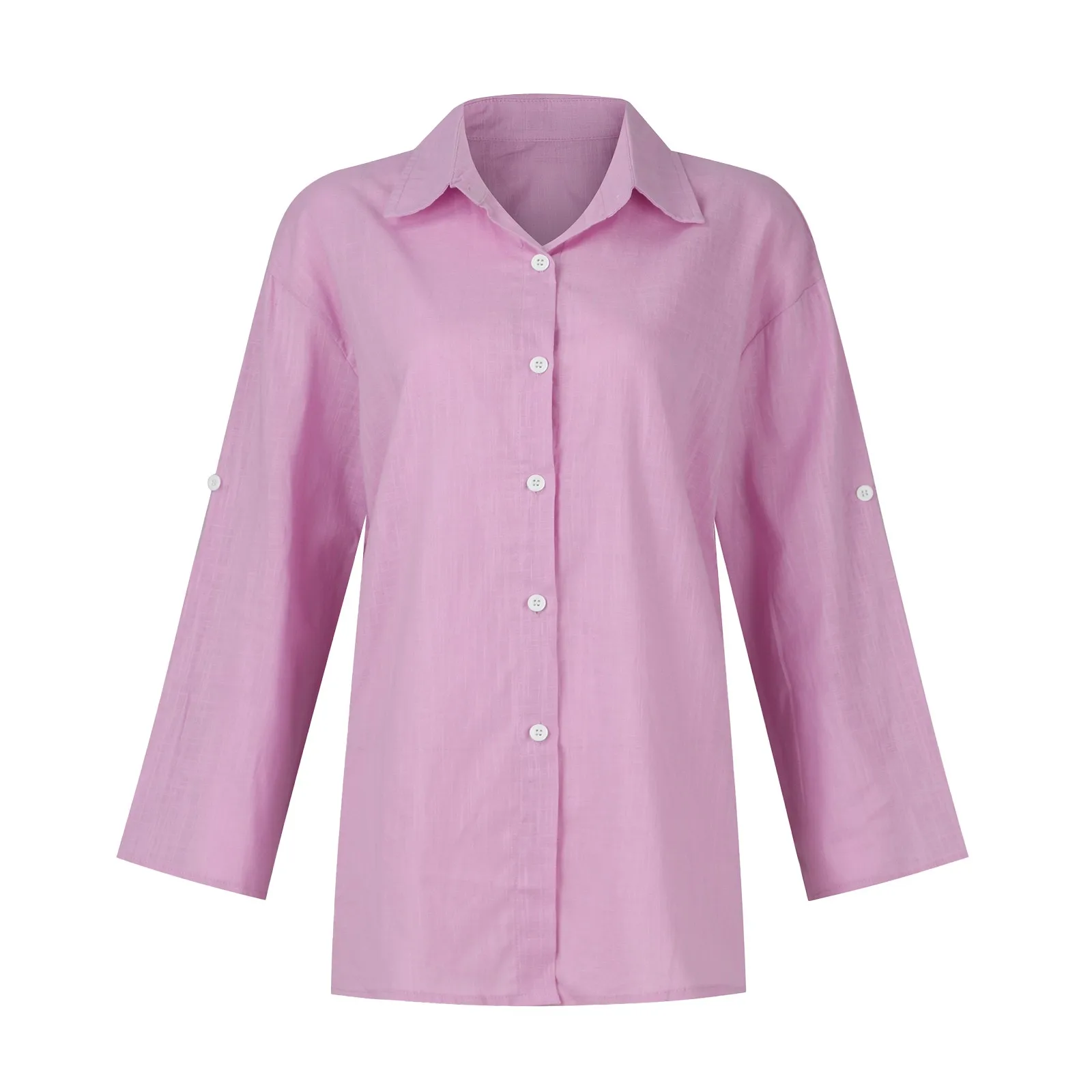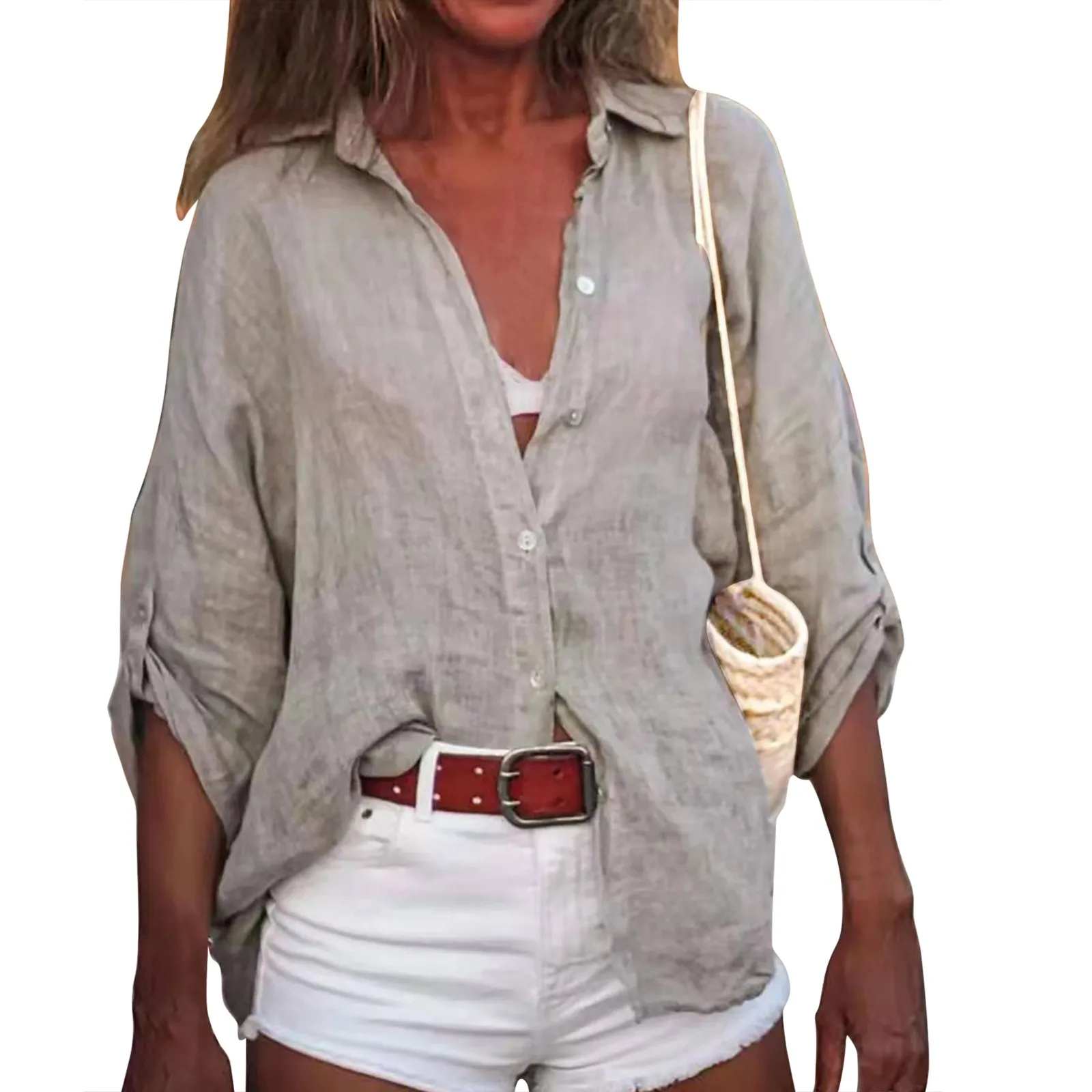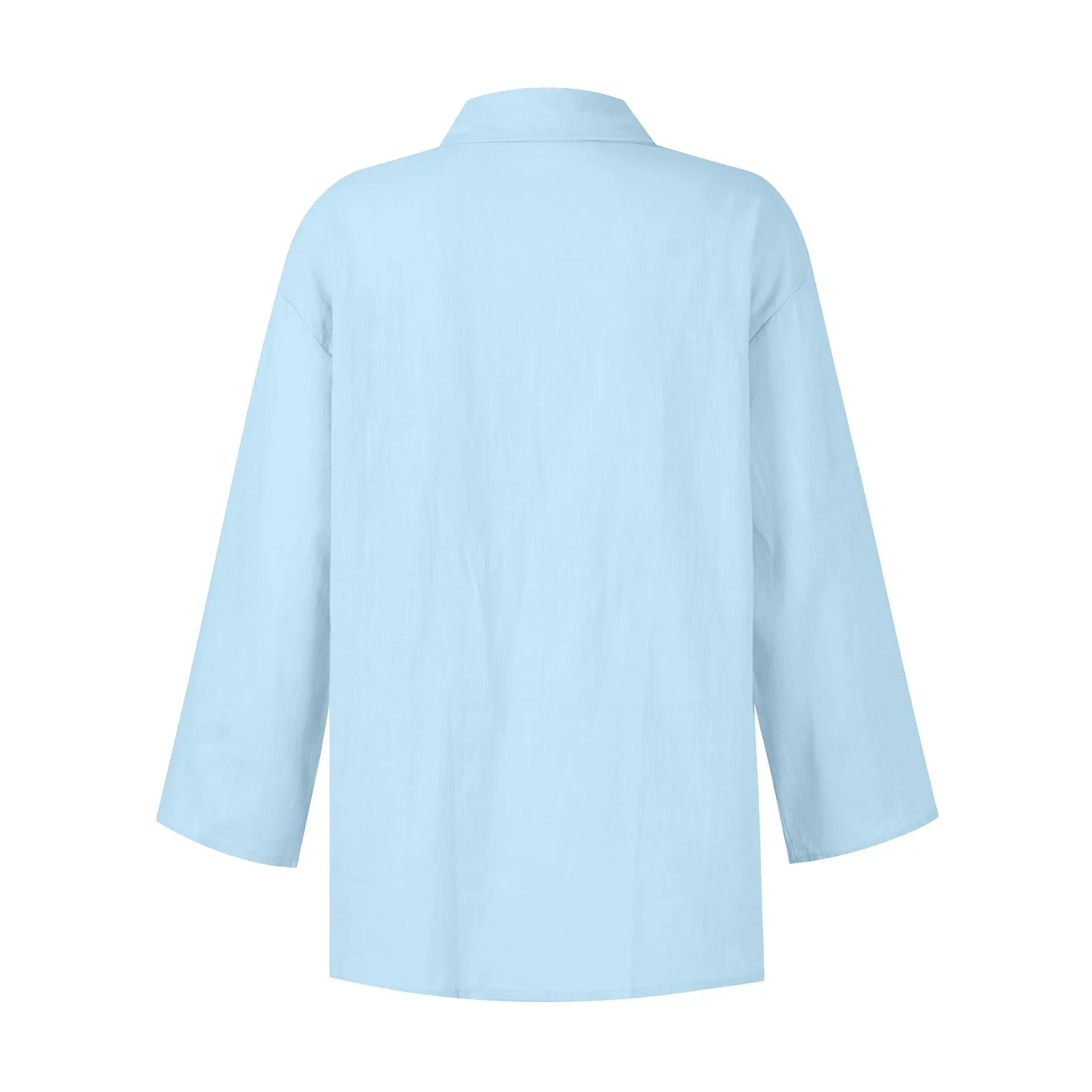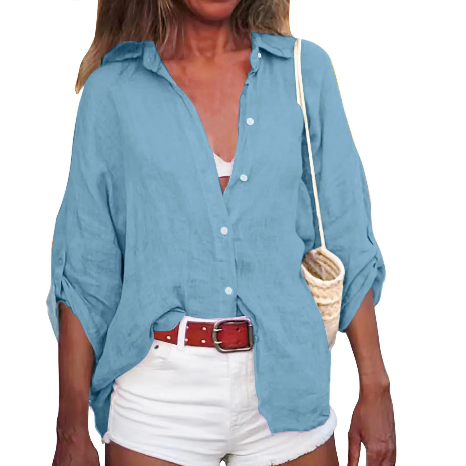 Summer Plus Size Cotton Linen Solid Color Seven-Point Sleeve Shirt V-Neck For Ladies Loose Casual Lightweight Camisas De Mujer
