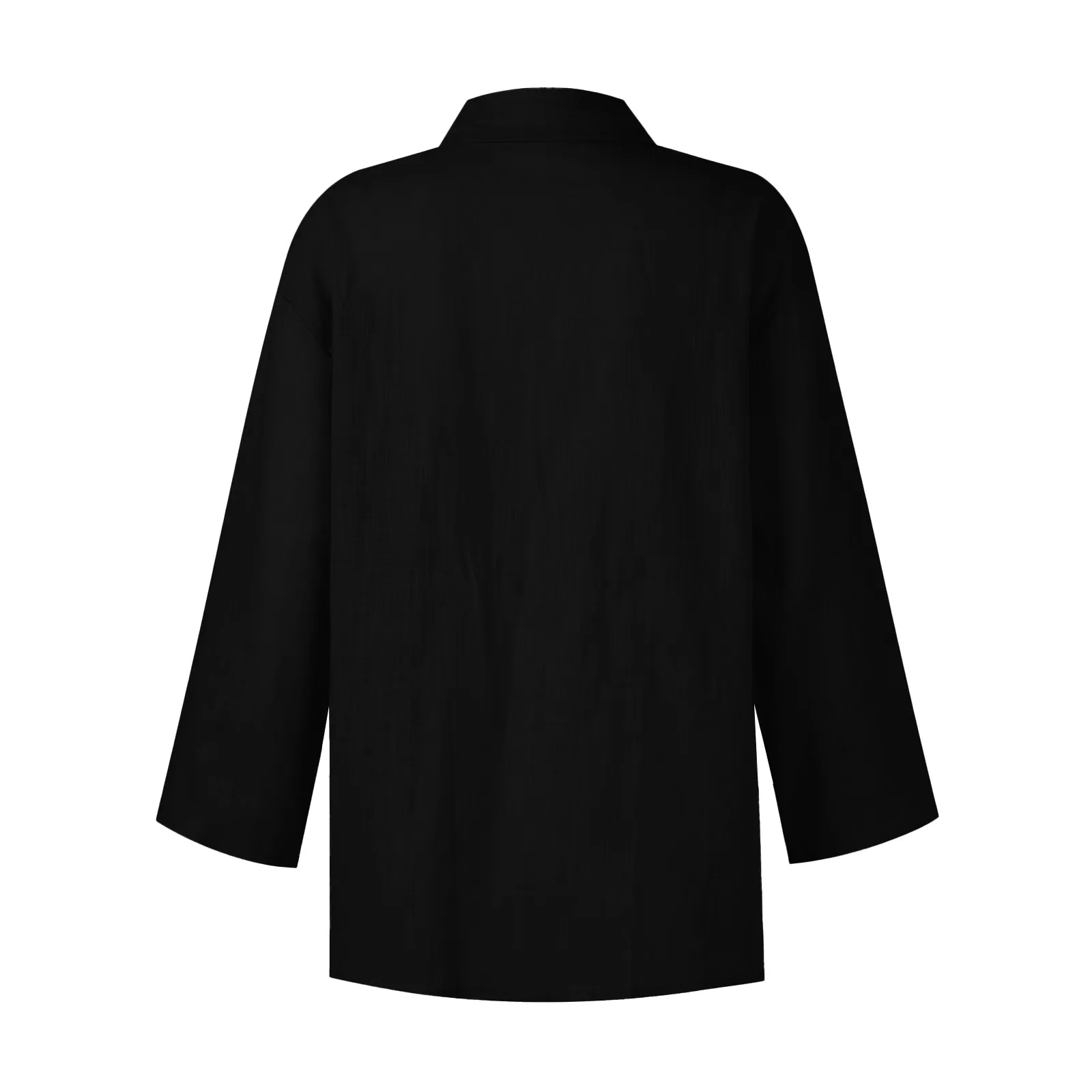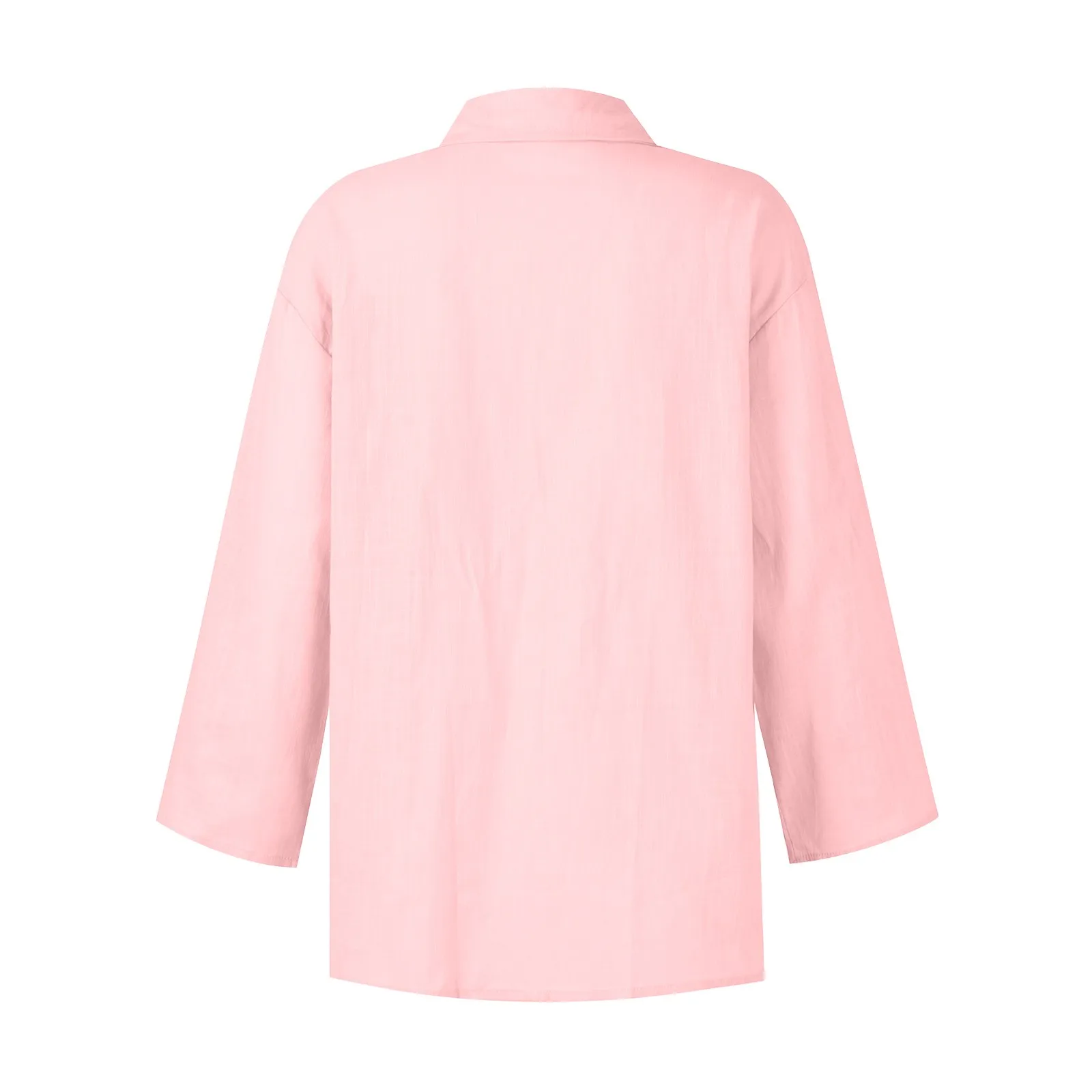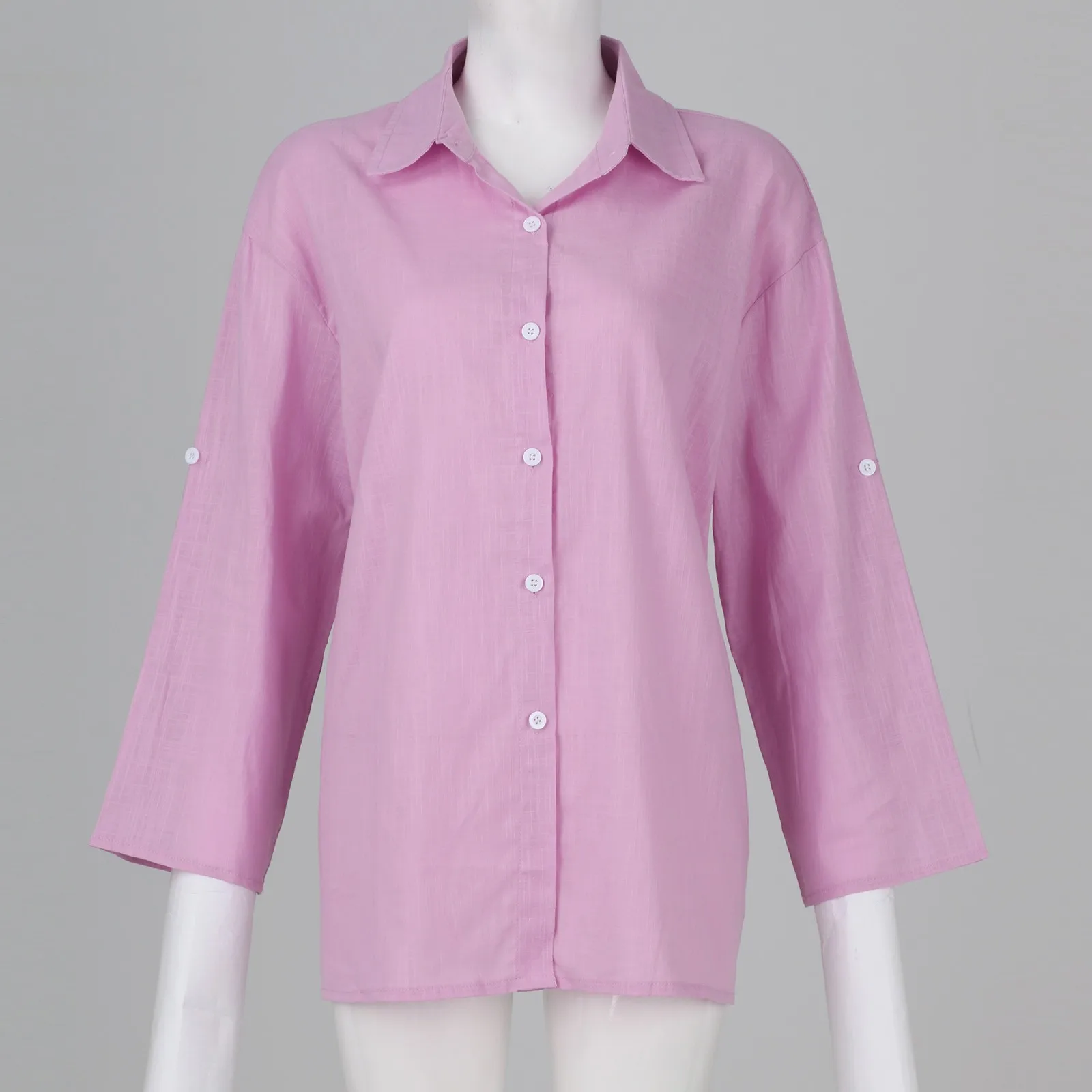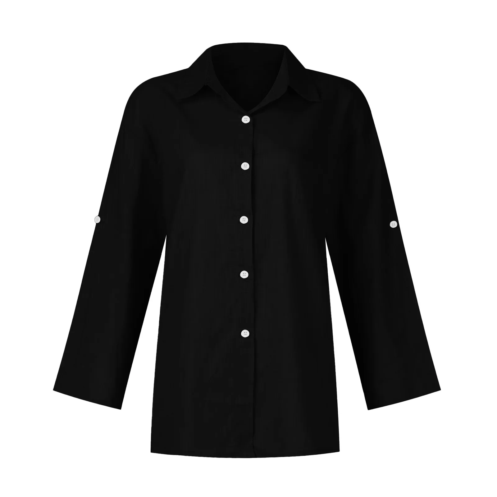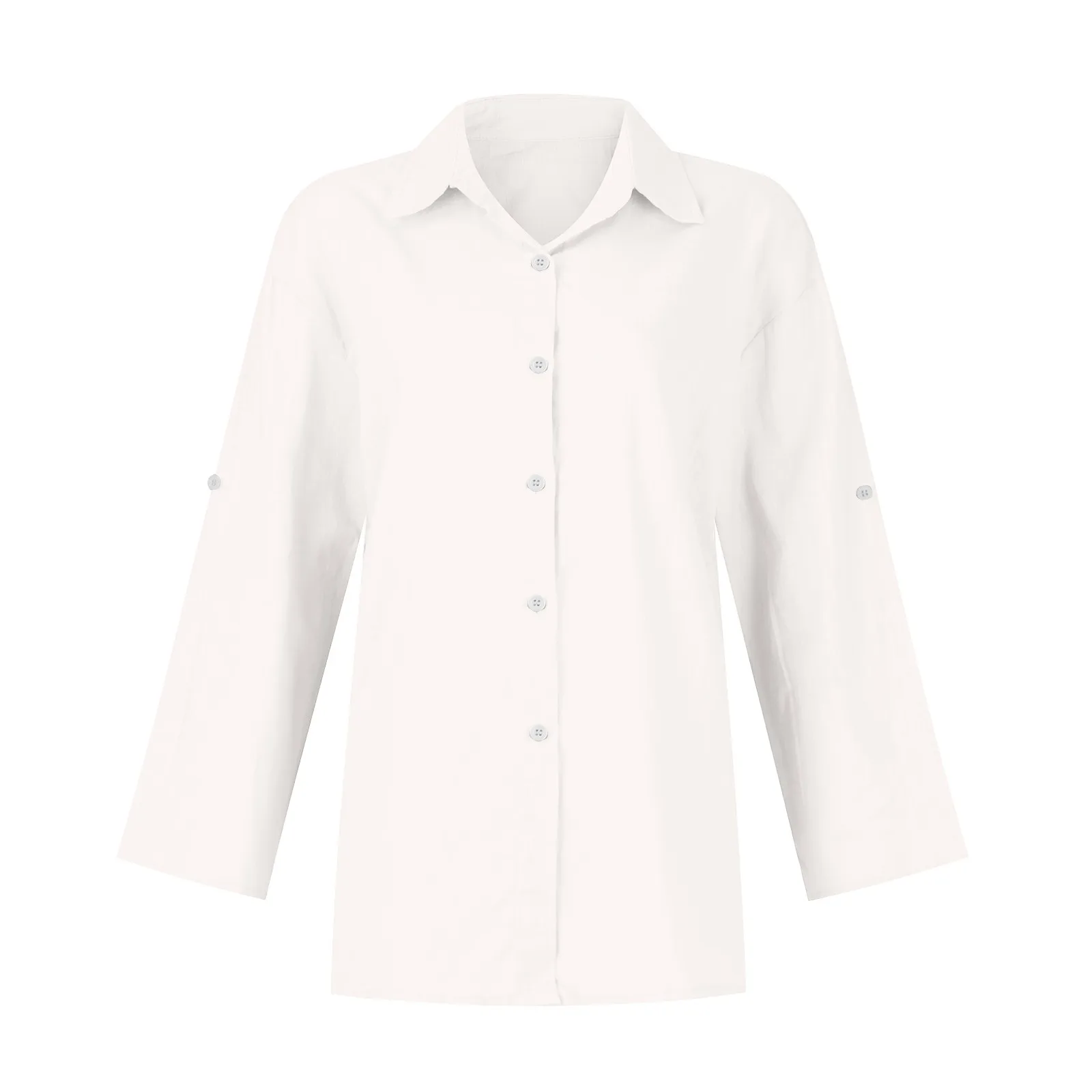 Summer Plus Size Cotton Linen Solid Color Seven-Point Sleeve Shirt V-Neck For Ladies Loose Casual Lightweight Camisas De Mujer