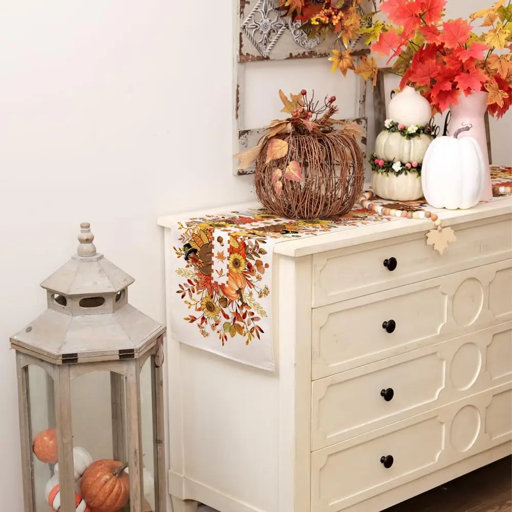 Thanksgiving Fall Turkey Pumpkin Floral Linen Table Runner for Autumn Kitchen Wedding Party Table Decor Thanksgiving Decorations